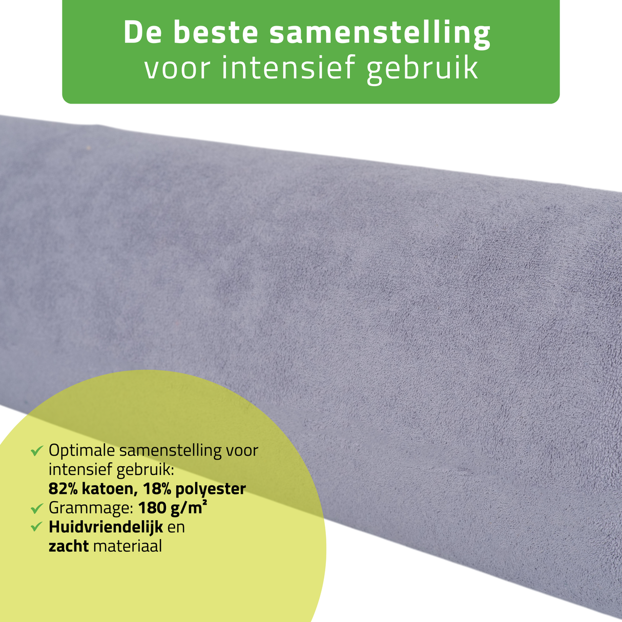 Optimale samenstelling voor intensief gebruik: 82% katoen, 18% polyester: natuurlijk katoen zorgt voor zachtheid en absorptie, terwijl de toevoeging van polyester de duurzaamheid en elasticiteit verhoogt.