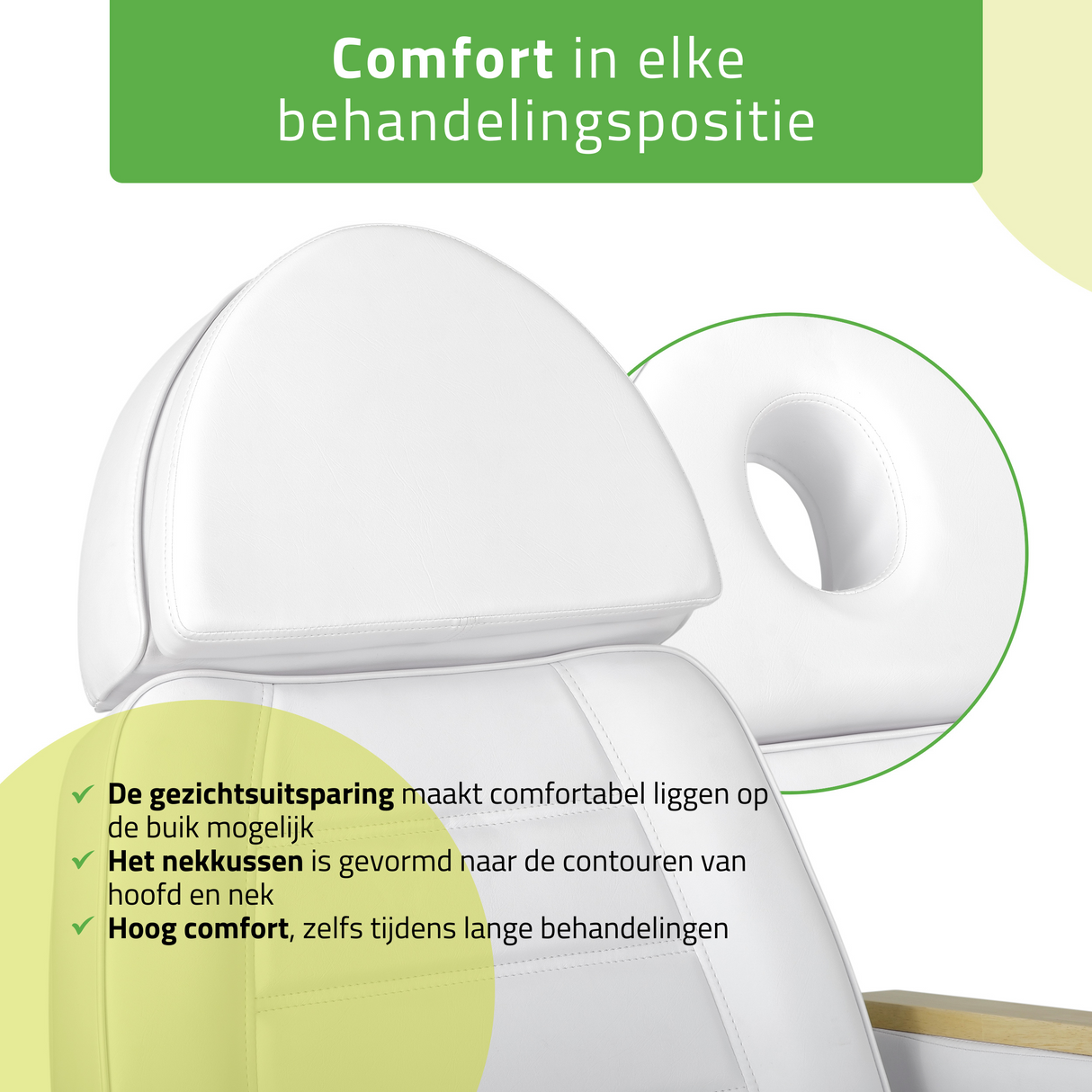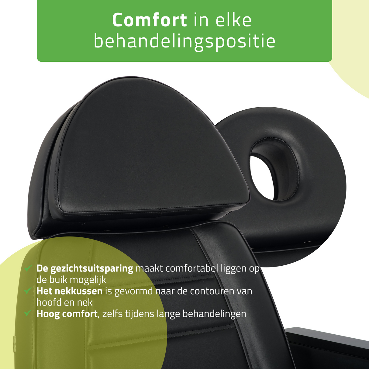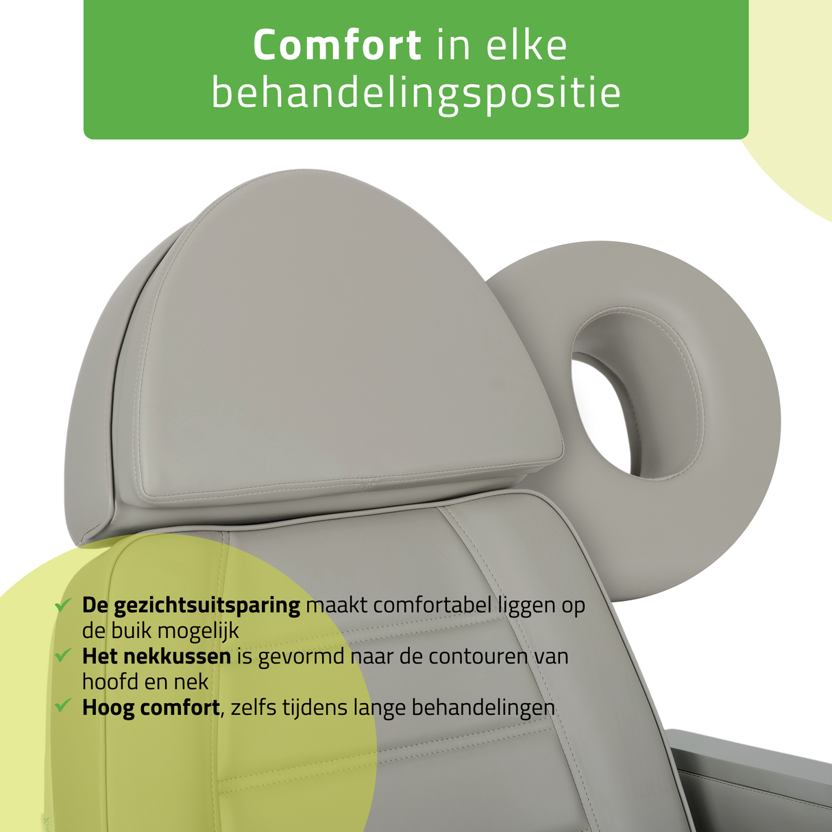 - gezichtsuitsparing in de hoofdsteun: speciaal gevormde uitsparing biedt comfortabele houding bij behandelingen in buikligging.