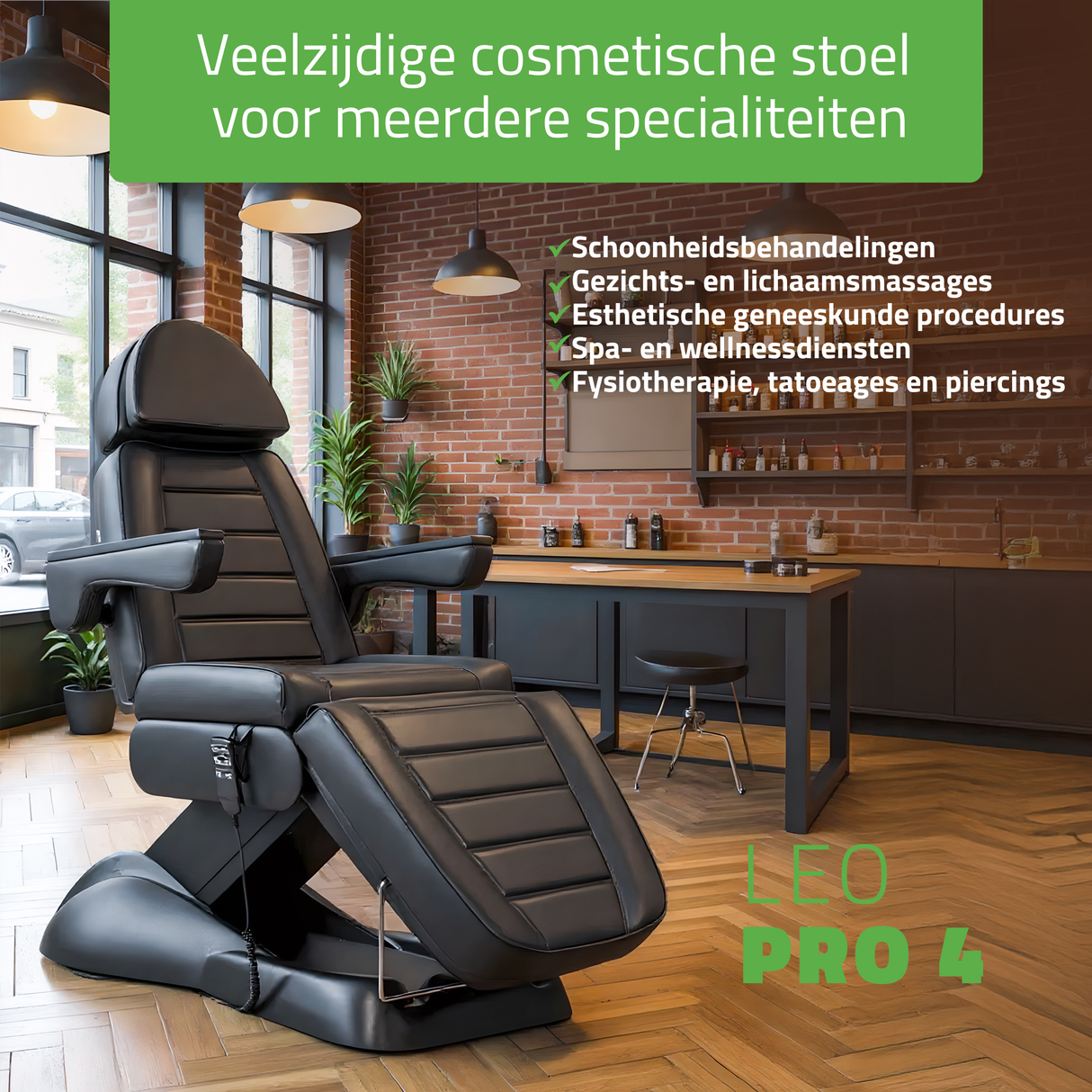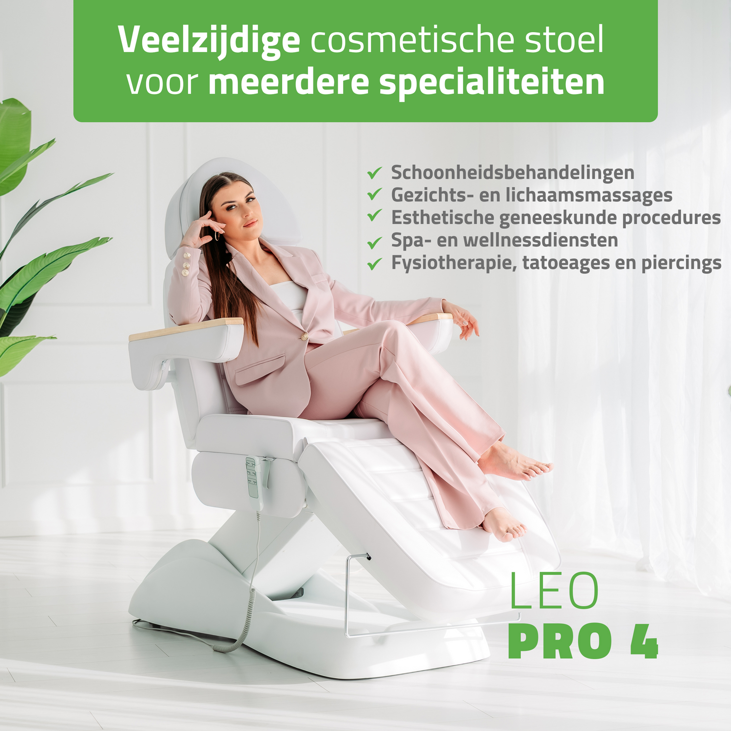 Leo PRO 4 is een betrouwbare elektrische cosmetische stoel die moderne functies combineert met elegant design – de ideale keuze voor professionals die gericht zijn op professionaliteit, comfort en kwaliteit.