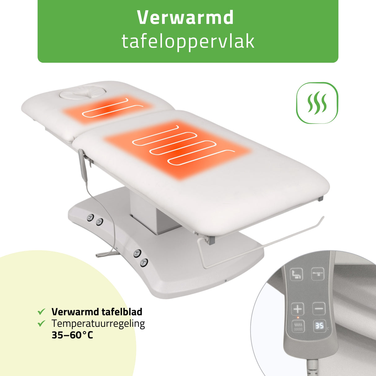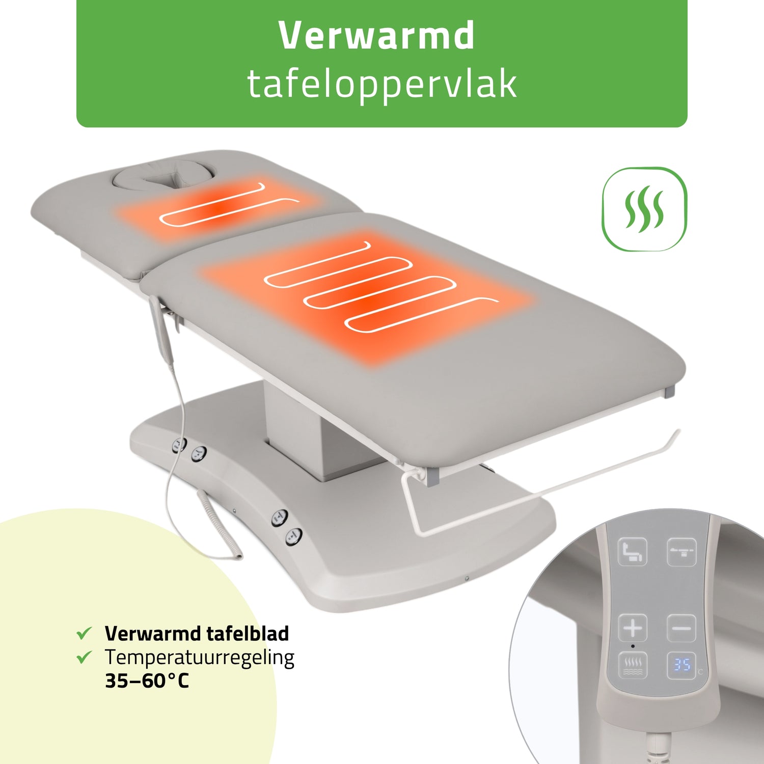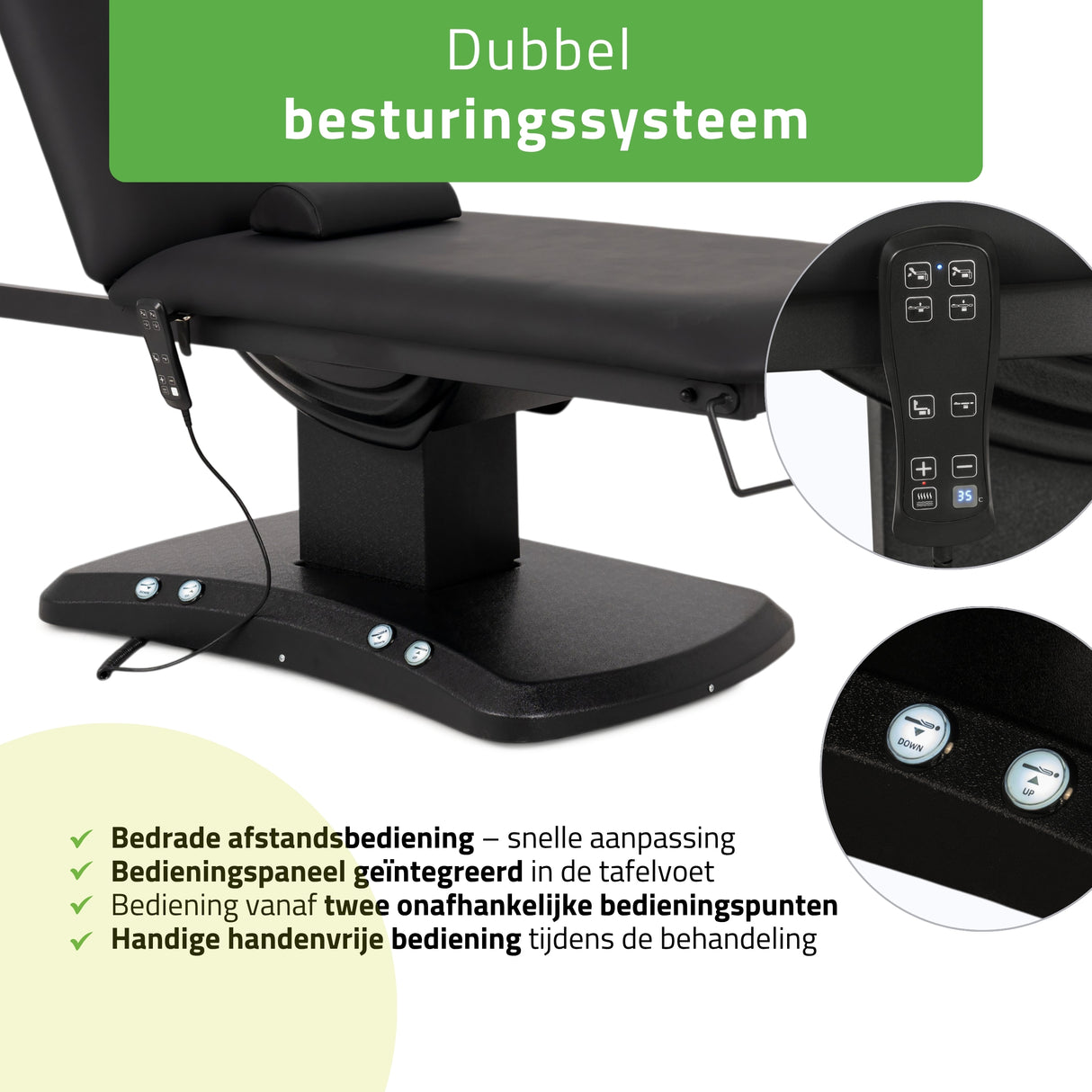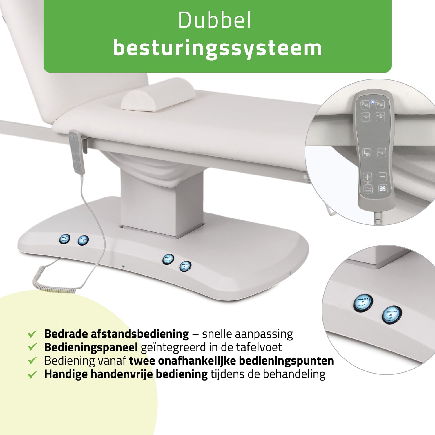 De afstandsbediening maakt het mogelijk om snel terug te keren naar vooraf ingestelde posities, wat de voorbereiding op de volgende behandeling vergemakkelijkt. - Verwarmd ligoppervlak (35–60°C)