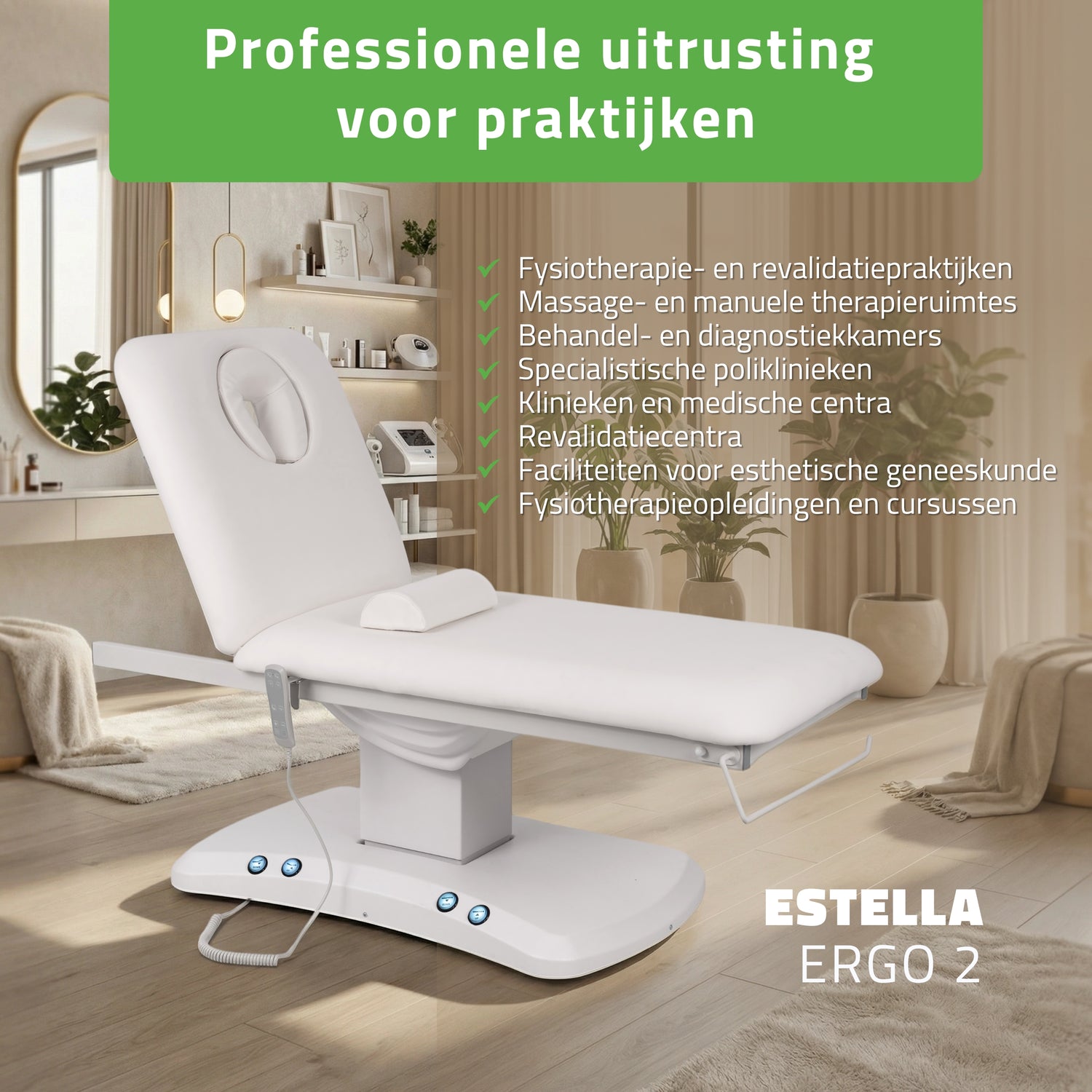 De Estella ERGO 2 is een professionele behandeltafel die is ontworpen voor stabiele patiëntpositionering en ergonomisch werken. De elektrische hoogte- en rugverstelling maken een nauwkeurige afstemming op elke behandeling mogelijk, terwijl de robuuste constructie veiligheid en comfort garandeert in de dagelijkse praktijk.