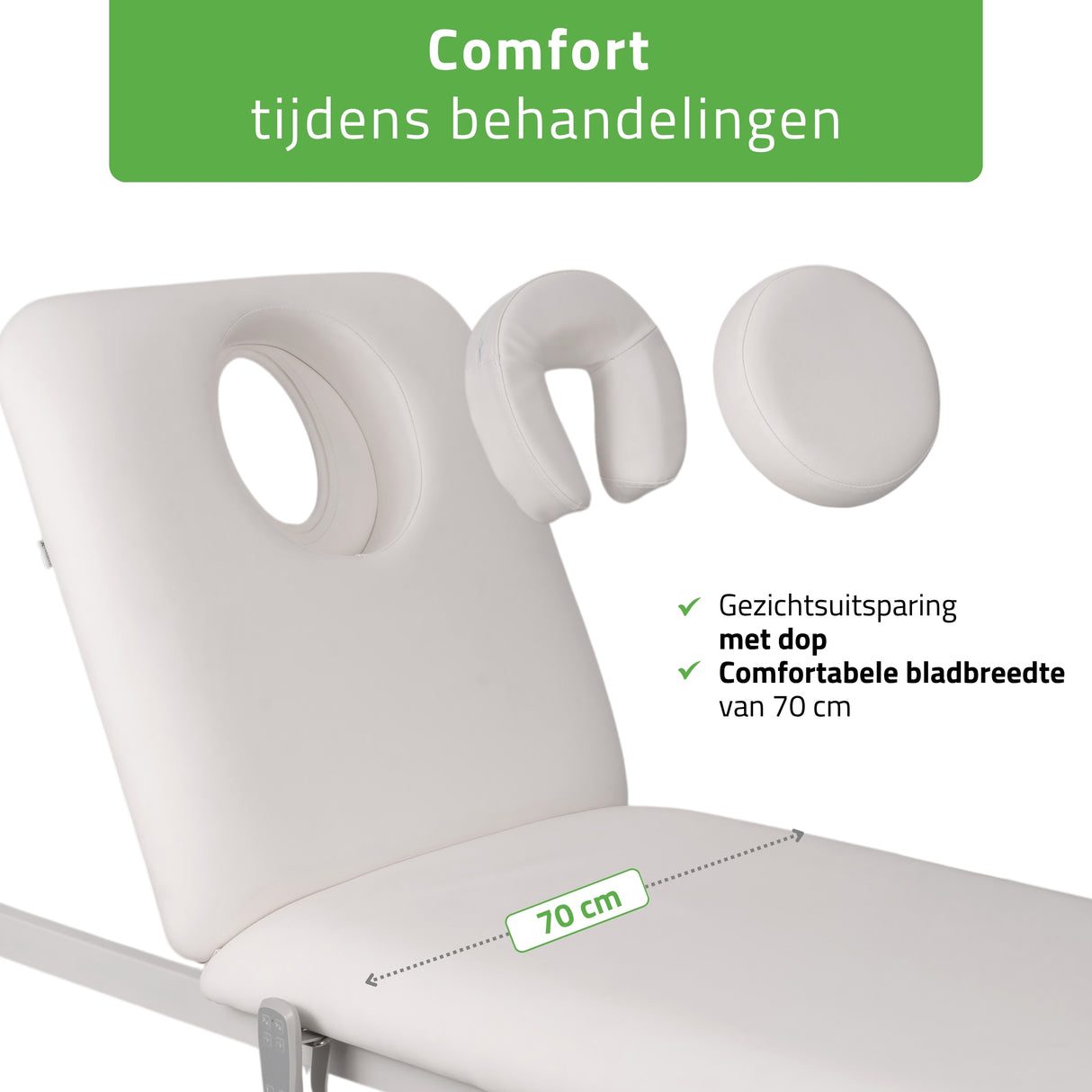 Instelbare temperatuur verhoogt het comfort van de patiënt, vooral bij langere behandelingen. - Gezichtsuitsparing met dop in het hoofdgedeelte