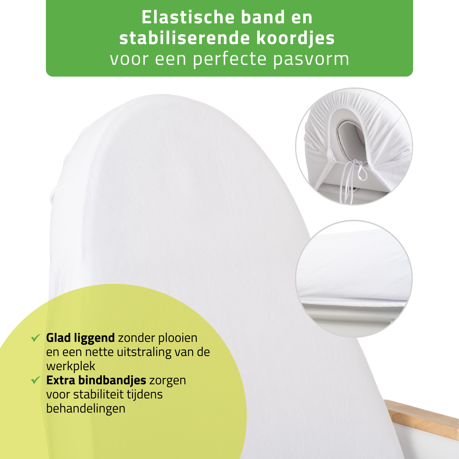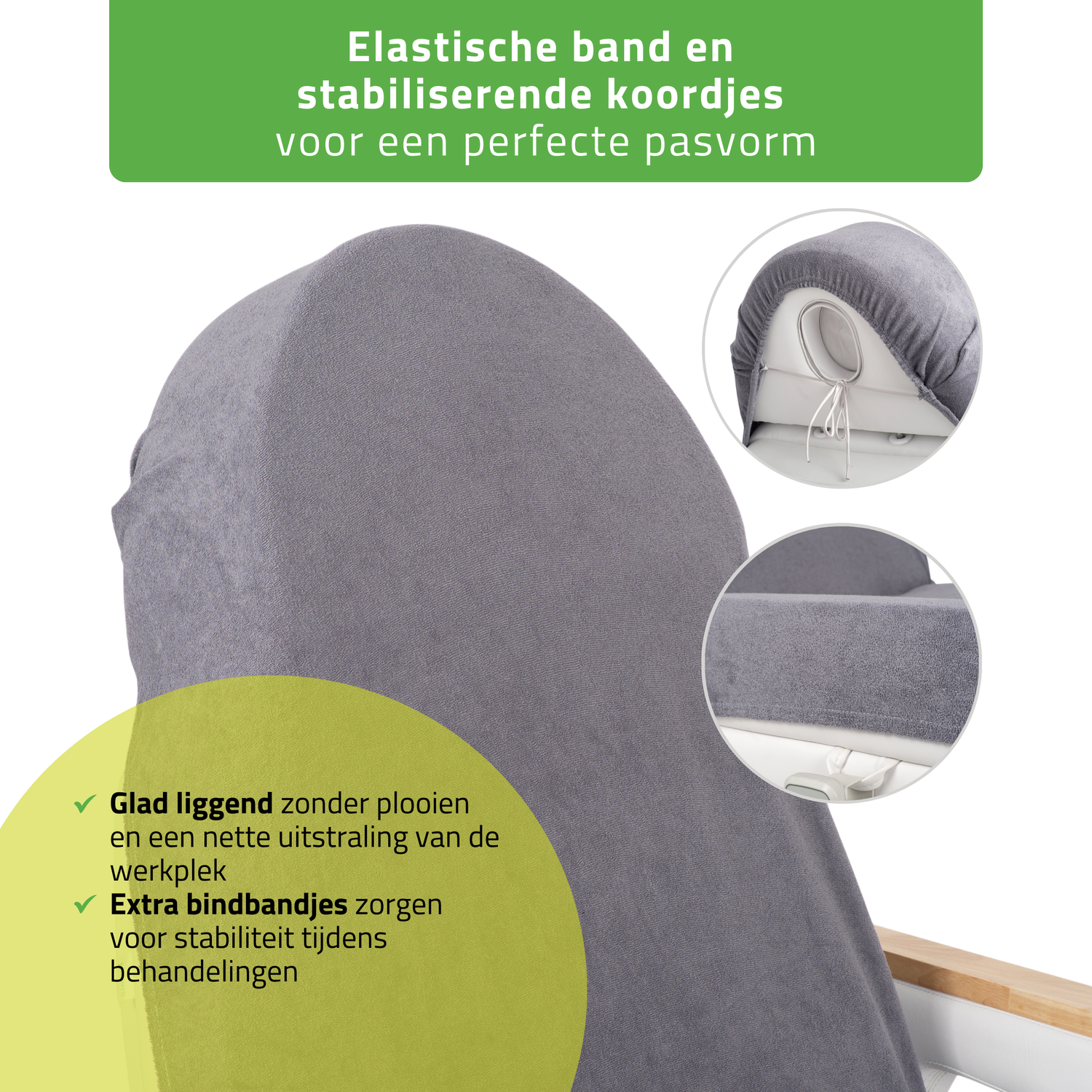 Rondom ingenaaid elastiek en extra stabiliserende koorden: het elastiek maakt het snel en eenvoudig om de hoes aan te brengen en zorgt voor een gelijkmatige pasvorm. Extra koorden verbeteren de pasvorm, vooral bij het hoofdgedeelte, en houden de hoes tijdens de hele behandeling op zijn plaats.
