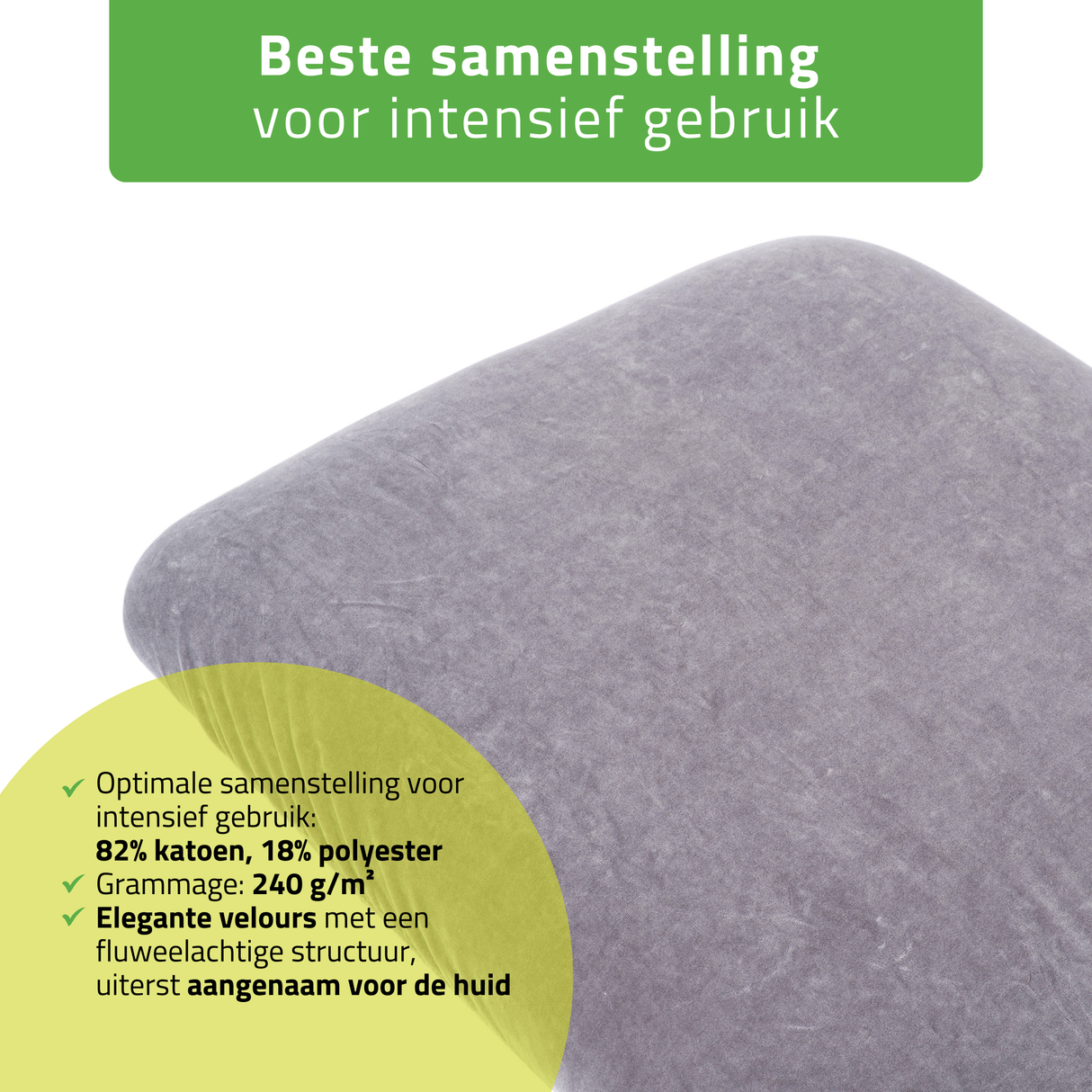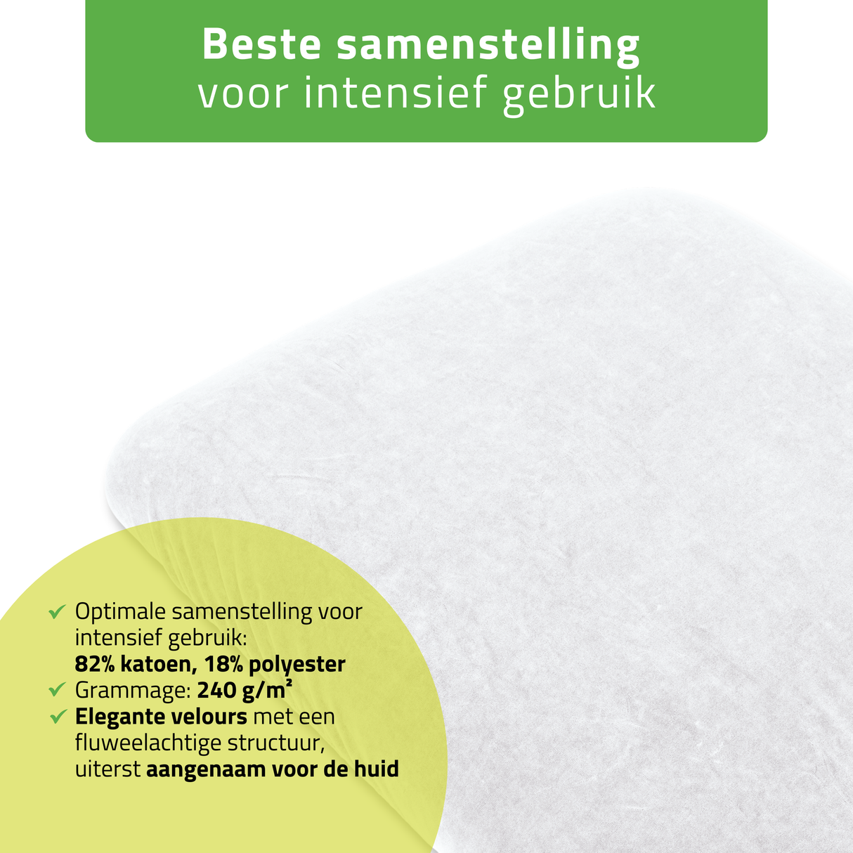 Optimale samenstelling voor intensief gebruik: 82% katoen, 18% polyester: natuurlijk katoen zorgt voor zachtheid en een goed absorptievermogen, terwijl polyester de duurzaamheid en elasticiteit verhoogt.