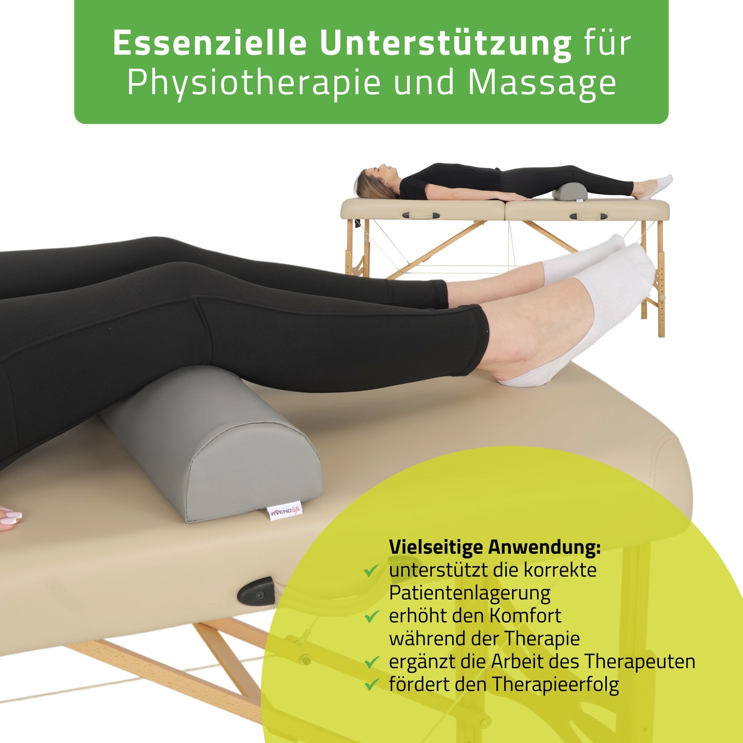 Die Halbrolle der Marke Aveno Life ist eine vielseitig einsetzbare Lagerungshilfe für Massage, Physiotherapie und Rehabilitation. Ideal für alle, die bewährte Lösungen zu einem günstigen Preis suchen. Die „Comfy Base“-Polsterung harmoniert perfekt mit den klappbaren Massageliegen der Marke Aveno Life aus der Economy-Kategorie.